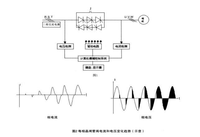 當(dāng)起動完成后, 三相旁路接觸器 J 自動吸合, 電動機(jī)投入電網(wǎng)運(yùn)行(見 圖 1)。輸入/輸出電壓波形和電流變化的波形